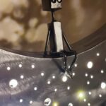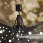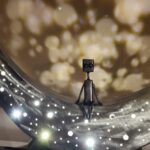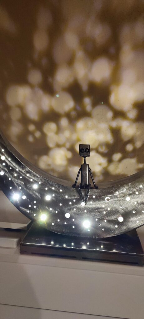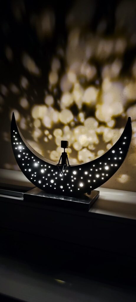 La lune est finement percée de petits trous qui, une fois la lumière allumée, projettent une constellation d’étoiles sur les murs… créant une atmosphère féérique et apaisante.