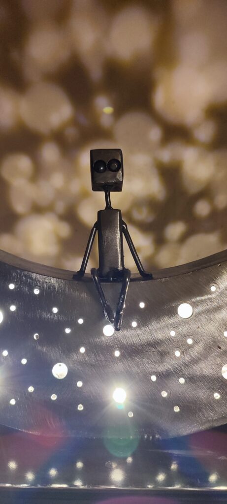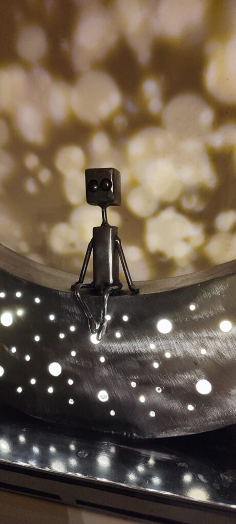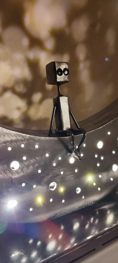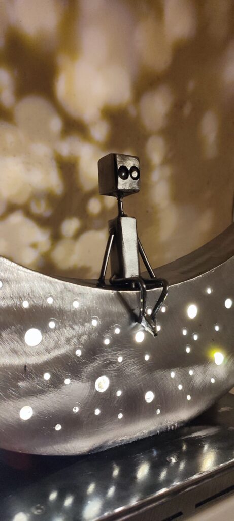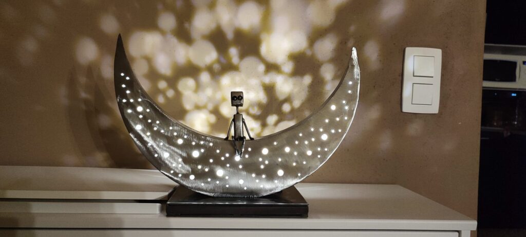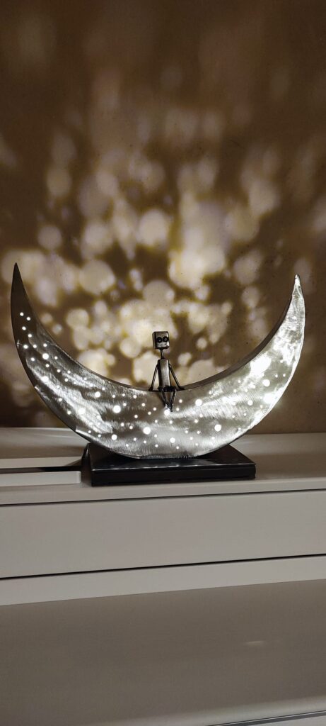 Je vous présente une lampe en métal représentant un délicat croissant de lune, entièrement façonné à la main.