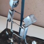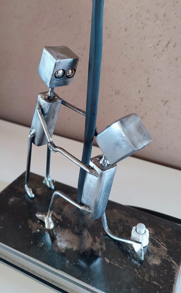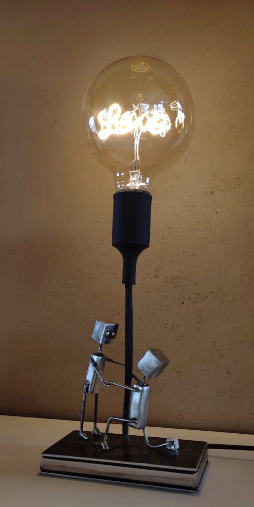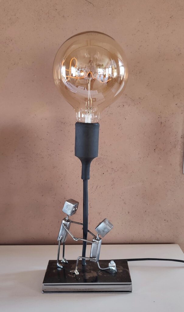 Je vous présente une lampe pleine d’émotion, mettant en scène deux personnages en métal dans un moment suspendu dans le temps.